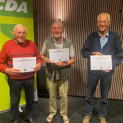 Naast dit drietal ontvingen nog zes leden deze bijzondere onderscheiding. Zij kregen de oorkonde persoonlijk thuis uitgereikt. In totaal gaat het om negen leden die zich in 1975 aansloten bij de federatie die later zou uitgroeien tot het Christen-Democratisch Appèl (CDA). Samen met zo’n 3.000 andere pioniers gaven zij destijds hun vertrouwen aan de nieuwe christendemocratische samenwerking — een keuze die zij tot op de dag van vandaag trouw zijn gebleven.