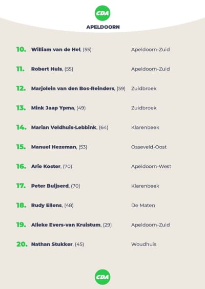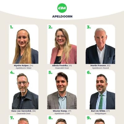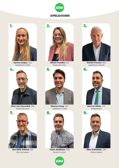 De lijst wordt aangevoerd door Myrthe Kuiper (34) die in april al door de leden werd gekozen als lijsttrekker. Zij wordt gevolgd door raadsleden Alinda Fredriks (41) en Martin Fransen (62). Op plek vier staat fractievertegenwoordiger Hans van Gerrevink (56) en daarna volgen Wouter Kamp (37), Bert de Wilde (47), Jan Dirk Vriend (61), Twan Derksen (23) en Olav Scholten (36). Het is een diverse lijst geworden qua leeftijden, achtergronden en expertise. Het CDA Apeldoorn verwacht te groeien bij de verkiezingen van 2026 en is daar met deze lijst helemaal klaar voor.