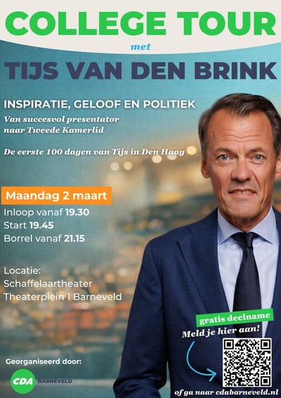 Hoe is het om na jaren als journalist ineens zelf politicus te zijn? Wat neem je mee uit de mediawereld naar Den Haag, en hoe speelt geloof daarin een rol? Tijs van den Brink vertelt erover tijdens de College Tour op maandag 2 maart in het Schaffelaartheater.
