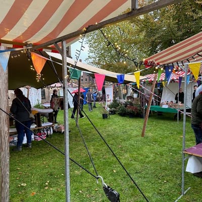 en gasten gericht naar de Oogstmarkt voor mooie lokale producten.