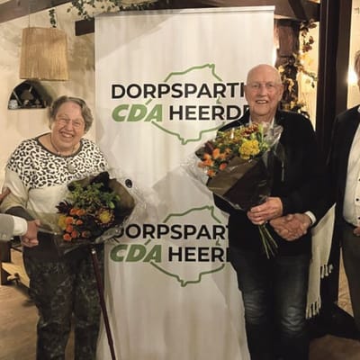 Mevr. Crum en dhr. Hagedoorn zijn dit jaar 50 jaar lid van het CDA. Tijdens de ledenvergadering werden deze leden van het eerste uur door Luuk de Vos, voorzitter van de Dorpspartij CDA, toegesproken. Mevr. Crum was met 22 jaar al actief als vrijwilliger bij de voorloper van het CDA, de Christelijk-Historische Unie. Na de fusie in 1980 tussen de ARP, CHU en KVP in het CDA heeft ze altijd op de kieslijst voor de gemeenteraadsverkiezingen gestaan. Mevr. Crum geeft aan dat het CDA vanwege de christelijke waarden zoals naastenliefde belangrijk voor haar is. Dhr. Hagedoorn is steunlid van het CDA. Hoewel hij het niet altijd met het CDA eens is, is hij altijd lid gebleven. Beiden jubilarissen ontvingen van Hans van Ark en Luuk de Vos namens het landelijk CDA en de Dorpspartij CDA Heerde als blijk van waardering het certificaat Lid van het eerste uur en een bos bloemen. Ook de jubilarissen dhr. Van Ommen en dhr. Hogenbirk zijn dit jaar 50 jaar CDA-lid. Vanwege hun leeftijd en gezondheid konden zij niet bij de algemene ledenvergadering aanwezig zijn. Binnenkort zullen zij door het bestuur van de Dorpspartij CDA het certificaat en de bloemen thuis uitgereikt krijgen.