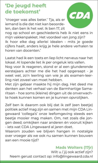 De jeugd heeft de toekomst, en de ideeën. CDA Lingewaard maakt daar graag gebruik van. Hieronder treft u de gedachten van een van de Lingewaardse...