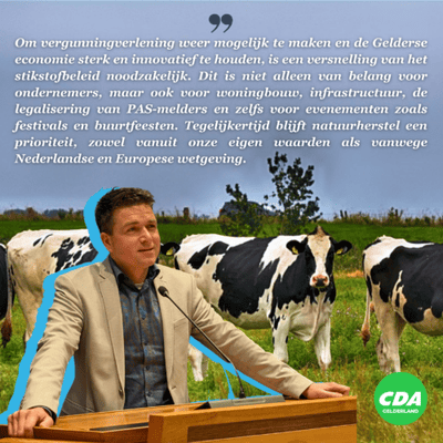 Om vergunningverlening weer mogelijk te maken en de Gelderse economie sterk en innovatief te houden, is een versnelling van het stikstofbeleid noodzakelijk. Dit is niet alleen van belang voor ondernemers, maar ook voor woningbouw, infrastructuur, de legalisering van PAS-melders en zelfs voor evenementen zoals festivals en buurtfeesten. Tegelijkertijd blijft natuurherstel een prioriteit, zowel vanuit onze eigen waarden als vanwege Nederlandse en Europese wetgeving.