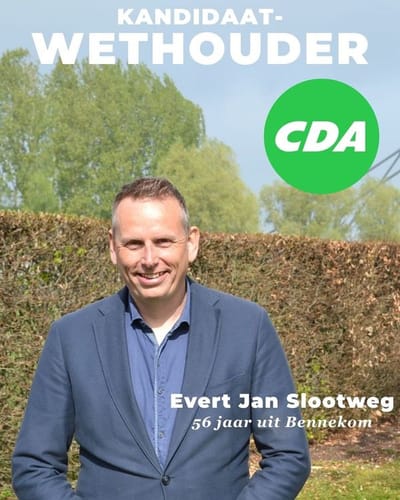 Tevens is Evert Jan Slootweg als kandidaat wethouder voor de nieuwe raadsperiode gekozen. Hiermee weet het CDA de huidige wethouder uit Bennekom en zijn expertise, betrokkenheid en ervaring te behouden voor West Maas en Waal.