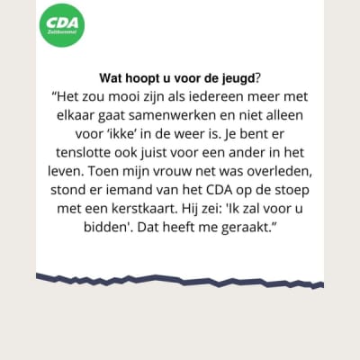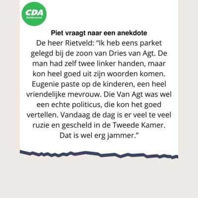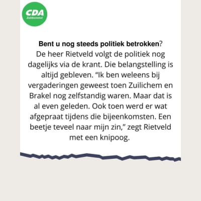 "Je was hier een tijdje geleden ook, omdat ik al zo lang lid van het CDA ben. Ik herinner het me weer.” Tijdens het gezellige bezoek stelde Piet aan de heer Rietveld een paar vragen. Bij het weggaan wijst de heer Rietveld naar zijn schuurtje. “Ik moet nog het dak op om de dakbedekking te vervangen. Maar ik merk wel dat ik wat ouder word en na m’n knieoperatie ben ik er niet leniger op geworden.”