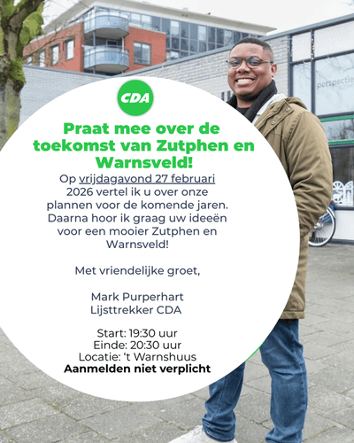 Op vrijdagavond 27 februari 2026 organiseert het CDA Zutphen-Warnsveld een bijeenkomst over de toekomst van Zutphen, Warnsveld en De Hoven.