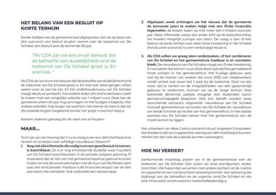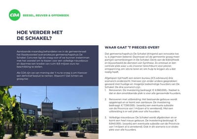 Aanstaande maandag behandelen we in de gemeenteraad het Raadsvoorstel scenariokeuze gemeenschapshuis De Schakel. Concreet ligt de vraag voor of we kunnen instemmen met het voorstel om te kiezen voor een volledige nieuwbouw en daarmee een krediet van ruim 8,8 miljoen euro ter beschikking te stellen. Als CDA zijn we van mening dat ’t nu te vroeg is om hierover een definitief besluit te nemen. Waarom? Dat lichten we graag toe.