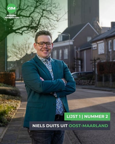 Maak kennis met 𝗡𝗶𝗲𝗹𝘀 𝗗𝘂𝗶𝘁𝘀 (30): geboren en getogen in Oost-Maarland en daar nog altijd thuis. Hij woont samen met zijn vriendin Anne in het dorp waar hij zo trots op is. In het dagelijks leven is Niels assetmanager bij een woningcorporatie, waar hij zich inzet voor goed en betaalbaar wonen. Binnen het CDA Eijsden-Margraten is hij raadslid en fractievoorzitter.