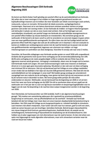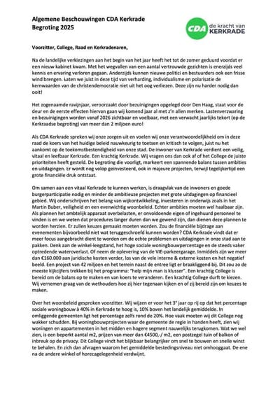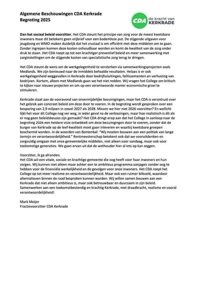 Vandaag werd de begroting 2025 van Gemeente Kerkrade behandeld, onderstaand de Algemene Beschouwingen van CDA Kerkrade die door fractievoorzitter Mark Meijer zijn uitgesproken.