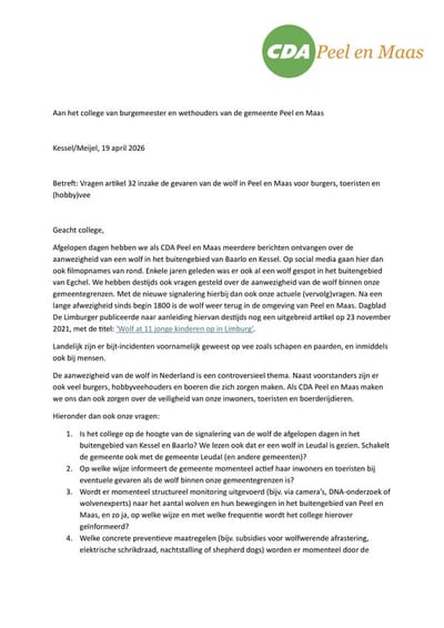 Afgelopen dagen hebben we als CDA Peel en Maas meerdere berichten ontvangen over de aanwezigheid van een wolf in het buitengebied van Baarlo en Kessel. Op social media gaan hier dan ook filmopnames van rond. Enkele jaren geleden was er ook al een wolf gespot in het buitengebied van Egchel. We hebben destijds ook vragen gesteld over de aanwezigheid van de wolf binnen onze gemeentegrenzen. Met de nieuwe signalering hierbij dan ook onze actuele (vervolg)vragen. Na een lange afwezigheid sinds begin 1800 is de wolf weer terug in de omgeving van Peel en Maas. Dagblad De Limburger publiceerde naar aanleiding hiervan destijds nog een uitgebreid artikel op 23 november 2021, met de titel: ‘Wolf at 11 jonge kinderen op in Limburg’.