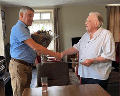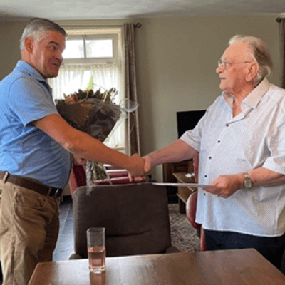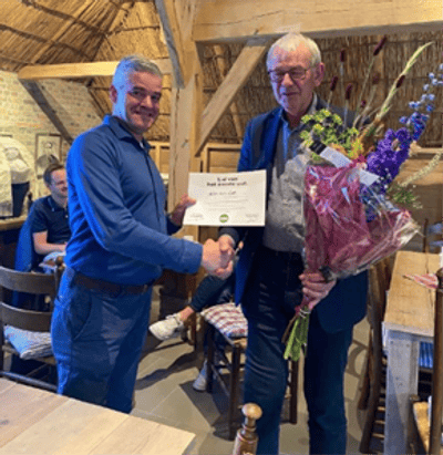Omdat het voor Grad van Krieken niet mogelijk was om naar de ALV te komen zochten voorzitter Eric Daandels en Marionne van Dongen hem thuis in Loosbroek op. Ook hij kreeg de oorkonde en de bloemen overhandigd. Samen aan de koffie en cake en in gezelschap van zijn vrouw en dochter werden herinneringen opgehaald. Ook Grad had nog volop goede tips en wie niet weet wat ‘Go us ifkes naor ’t weijzerke keijke’, die moet maar eens gaan buurten bij Grad in Loosbroek.
