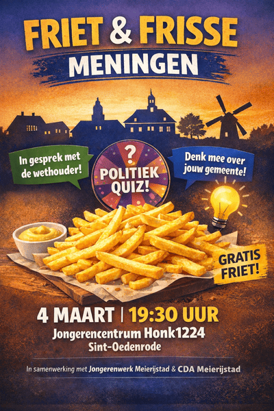 Op woensdag 4 maart 2026 organiseren jongerenwerk Meierijstad en CDA Meierijstad samen een politieke jongerenavond onder de naam Friet en Frisse Meningen. De avond vindt plaats bij Honk1224 en start om 19.30 uur.