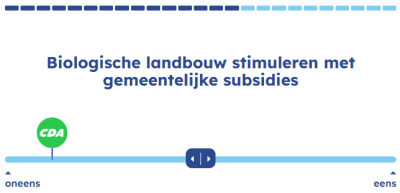 Als CDA zijn wij van mening dat biologische landbouw stimuleren belangrijk is, maar dat gemeentelijke subsidies niet het juiste instrument zijn: dit hoort bij provincie en Rijk en gemeentelijk geld moet naar onze lokale kerntaken.