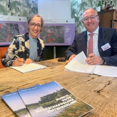 Wendy Oomes (algemeen directeur Ruimte voor Ruimte) en Patrick Kok (wethouder gemeente Nuenen) ondertekenen de samenwerkingsovereenkomst.
