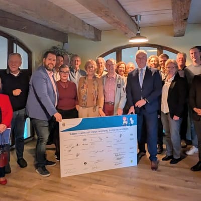 Met een groot bord vol handtekeningen markeert de gemeente Nuenen de officiële start van het uitvoeringsprogramma van de Woonzorgvisie. Op donderdag 13 november 2025 zetten alle deelnemende organisaties hun handtekening om hiermee de afspraken die in het uitvoeringsprogramma Woonzorgvisie staan te bekrachtigen.