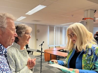 Vertegenwoordiging van fractie en bestuur van het CDA-Nuenen c.a. bedanken de afscheidnemende waarnemend burgemeester van harte met een attentie, een praatje en een schrijven.