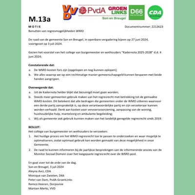 Ik wist niet dat de Gemeente zo onwijs veel betaald(e) aan WMO voorzieningen, denk aan de huishoudelijke hulp die zij inzetten bij mensen die dat nodig hebben. Ik roep dan toch iedere Gemeente op, om veelvoudiger gebruik te maken van hun regresrecht bij gevallen waar sprake is van een aansprakelijke verzekeraar/partij. Voorts is een update aan de Raad over het aantal gevallen, uiteraard wel gewenst om de zes maanden.