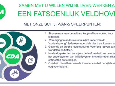 Team CDA Lokaal Veldhoven staat voor kwaliteit, betrouwbaarheid en samenwerking. Zeggen wat je doet en doen wat je zegt. Brede Welvaart voor iedereen is onze norm. Zorgen voor uitstekende voorzieningen die bereikbaar zijn met openbaar vervoer de fiets. Ons uitgangspunt daarbij is: iedereen doet ertoe en doet mee.
