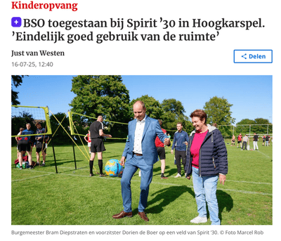 Eerder werd een verzoek voor BSO bij Spirit afgewezen door de gemeente Drechterland, vanwege een strikte interpretatie van de Alcoholwet. Tegelijkertijd kon in buurgemeente Stede Broec, bij sportvereniging De Zouaven, wél BSO in de kantine plaatsvinden. Dankzij aanhoudende inzet van CDA-raadslid Roy Hof komt daar nu verandering in.