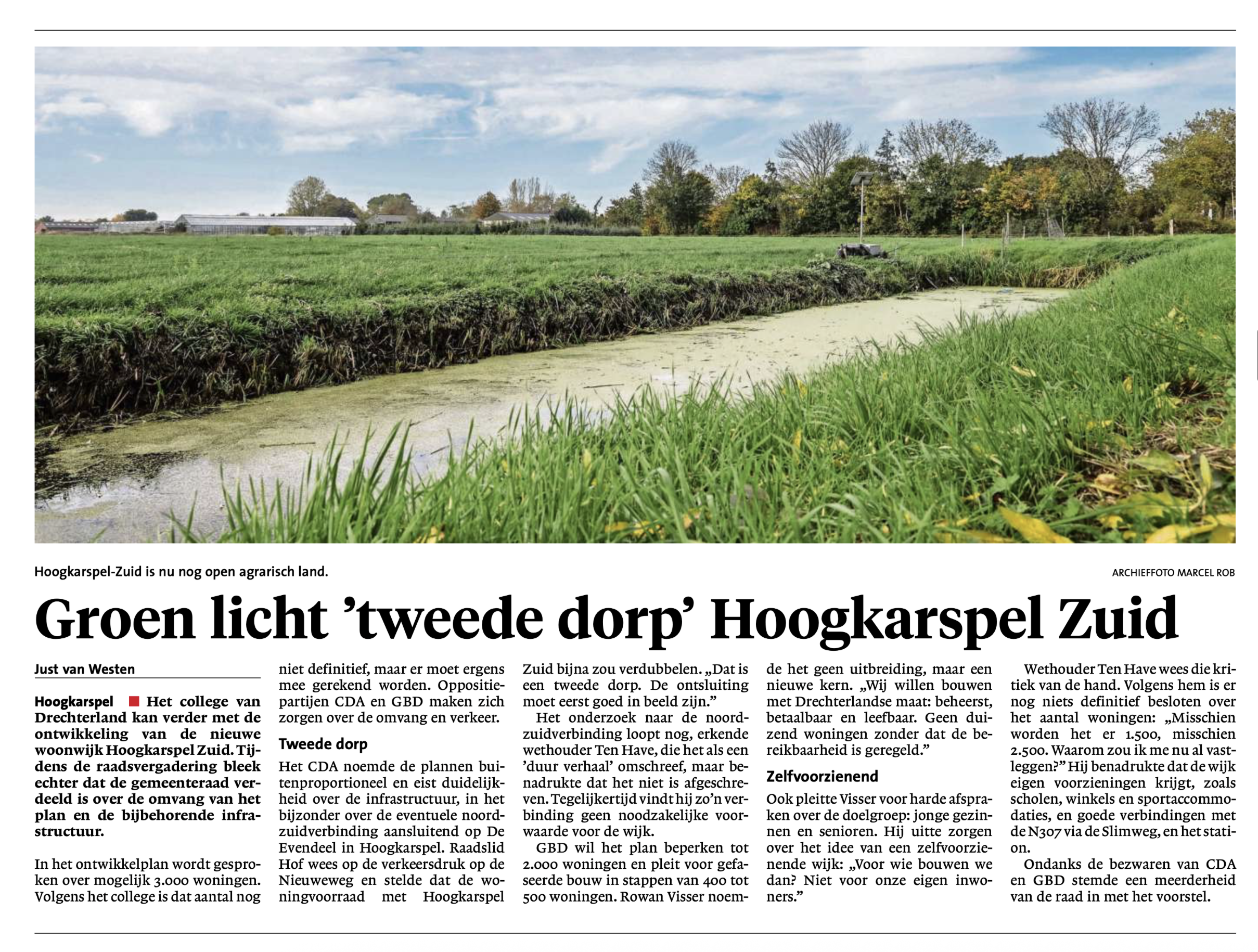 Hoogkarspel heeft momenteel 3.700 woningen en ruim 8.000 inwoners. Met Hoogkarspel-Zuid komen daar minimaal 2.500 woningen met circa 5.000 inwoners bij en hierop is ons dorp niet berekend. Als CDA staan we niet achter de ontwikkeling van Hoogkarspel-Zuid. Wij willen het dorpse karakter en de eigen identiteit in de kernen behouden en zien liever dat er op gepaste schaal gebouwd wordt: voor het dorp, passend bij het dorp en bovendien in al onze dorpen. Zo blijven we ons thuis voelen in ons eigen dorp en Drechterland!