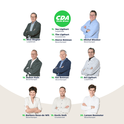 Ik ben trots dat ik opnieuw de partij mag aanvoeren. We hebben de afgelopen jaren laten zien dat het CDA staat voor betrokken en fatsoenlijke politiek. Met deze kandidatenlijst bouwen we daarop voort, met ruimte voor nieuwe ideeën en nieuwe gezichten, maar ook met de nodige ervaring en kennis. We hebben er veel zin in om Stede Broec ook de komende periode nóg beter te maken.