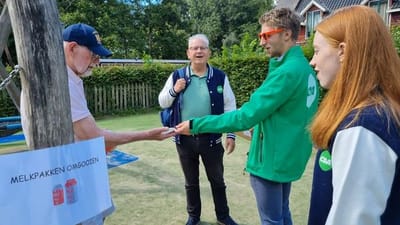 De kinderboerderij ontvangt geen subsidie en draait volledig op vrijwilligers. Om de vrijwilligers te bedanken dat zij elke week weer de mouwen opstropen en ook deze gezellige jubileumdag klaar stonden voor de kinderen, kregen zij uit handen van CDA-leden Jos, Paul, Jeroen en Maayke een lekkere stroopwafel.