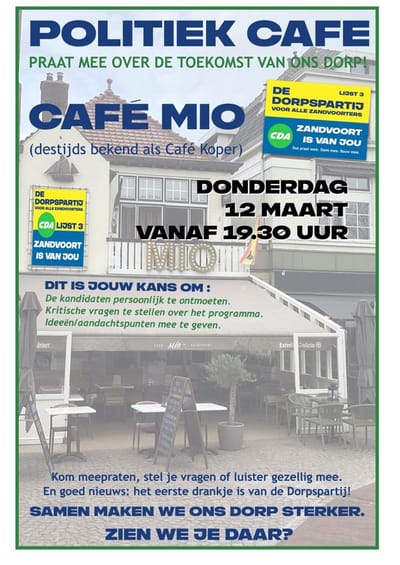 Wil je meepraten over de toekomst van Zandvoort? Heb je vragen over ons programma of ideeën voor het dorp? Kom langs, stel je vragen en ga in gesprek met onze kandidaten. Ook als je gewoon wilt luisteren, ben je van harte welkom.