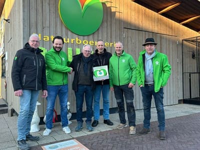 In 𝗡𝗶𝗲𝘂𝘄𝗹𝗲𝘂𝘀𝗲𝗻 heeft Natuurboerderij BalkInn de taart ontvangen uit handen van Roel Kouwen, Gosse Bijlenga en Gerrit Lahuis.