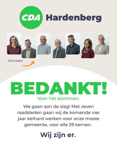 Afgelopen woensdag heeft het CDA Hardenberg 7 zetels weten te behalen bij de gemeenteraadsverkiezingen. Daarmee zijn wij de tweede partij in de gemeente Hardenberg. In...
