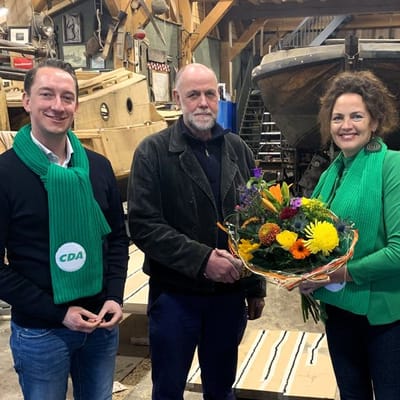 Dit jaar viel de keuze van de fractie van CDA Kampen op Aalt van den Hul. Hij is betrokken als bestuurslid bij de Stichting tot behoud van Kamper Botters. Ook is hij voorzitter van Oogstdag Kamperveen en spant hij zich in voor de terugkeer van de monumentale IJsselkogge naar Kampen. Onze raadsleden Jacolien van de Wetering en Niek Teune zochten hem op bij de Koggewerf. Daar nam hij de bloemen van Jacolien blij verrast in ontvangst.