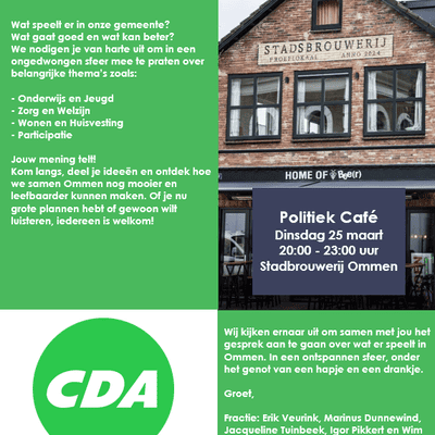 Wat speelt er in onze gemeente? Wat gaat er goed en wat kan er beter? We nodigen je van harte uit om in een ongedwongen sfeer mee te praten over belangrijke thema's. Je bent van harte welkom!