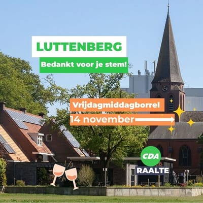 Maar CDA is méér dan verkiezingen alleen. Als CDA Raalte zijn we een vereniging met leden uit verschillende kernen van de gemeente. We hebben een duidelijke visie, een bestuur en een programma voor Raalte. Onze raadsleden doen hun werk in de gemeenteraad: ze vertegenwoordigen de inwoners, stellen kaders (regels en plannen), en controleren of burgemeester en wethouders hun werk goed doen. In Luttenberg hebben we een mooie club mensen die zich inzetten voor het CDA en ons dorp – en jij kunt daar ook bij aansluiten.