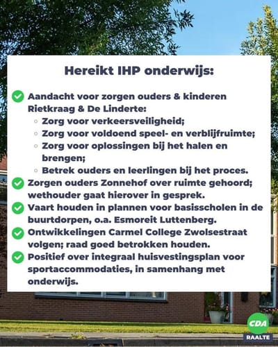 CDA Raalte heeft de verschillende moties rondom de situatie in Raalte-Noord gesteund, juist om deze aandachtspunten vast te leggen en om te leren van het gelopen proces. Vertrouwen vraagt om duidelijke afspraken, goede communicatie en zorgvuldige keuzes, met het belang van de kinderen altijd voorop.