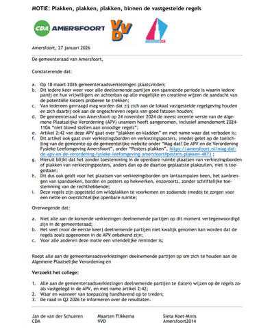 Daarom dienden CDA, VVD en Amersfoort2014 samen deze motie in. Wat betekent dat? Campagne voeren: ja! Wildplakken in de openbare ruimte: nee.