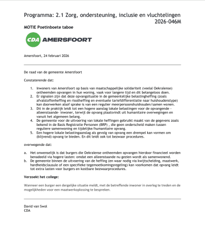CDA vindt het onwenselijk dat deze betrokken inwoners vervolgens te maken krijgen met hogere lokale belastingen, omdat zij in de administratie worden gezien als een meerpersoonshuishouden. Opvang uit humanitaire overwegingen mag geen financiële drempel worden.