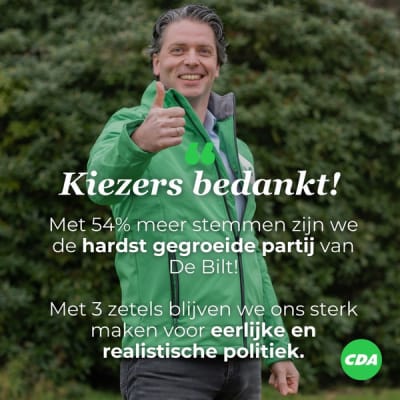 Bij de raadsverkiezingen van 18 maart 2026 heeft het CDA 2245 stemmen gehaald. Dat is 54% meer dan de vorige raadsverkiezingen, en vertaalt zich in 3 zetels! Daarmee zijn we de sterkst gegroeide partij van de Bilt, en doen we het ook fors beter dan het landelijke beeld van het CDA.
