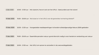In vijf webinars hoort u meer over het UPLG. De link om deel te nemen aan een webinar staat op de dag zelf op de webpagina. Vooraf aanmelden is niet nodig. U kunt de webinars ook later terugkijken.