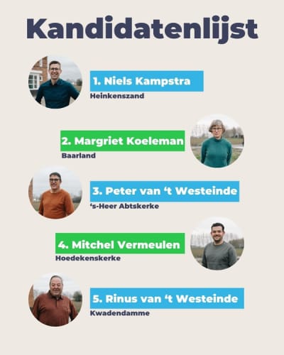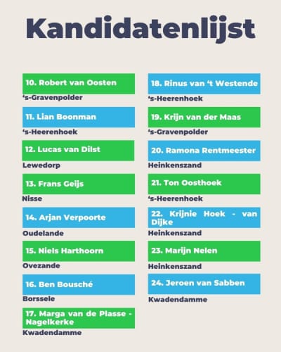 Onze volledige kandidatenlijst. Een mix van ervaren gezichten en nieuwe namen, jong en oud en vooral actief in onze hele gemeente.