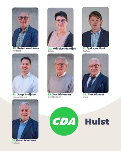 Karel Martinet sluit de lijst. De huidige raadsleden Piet van de Kerkhove en Carry Nijskens – de Maat hebben aangegeven het stokje door te geven aan de nieuwe generatie. Het CDA Hulst bedankt hen voor hun jarenlange inzet voor de partij en de afdeling in het bijzonder.