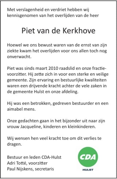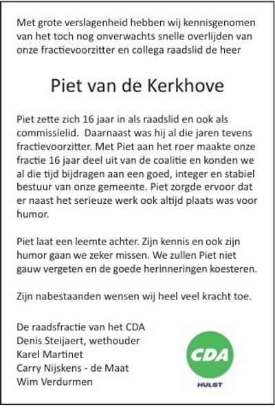 Met grote verslagenheid hebben wij kennisgenomen van het toch nog onverwachts snelle overlijden van onze fractievoorzitter Piet van de Kerkhove.