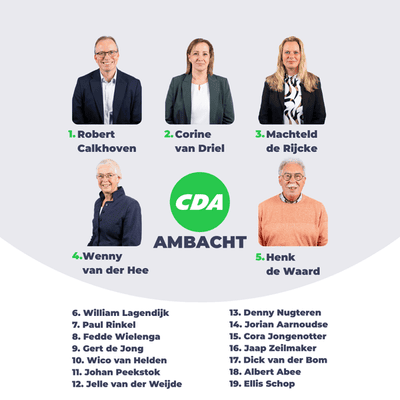 Met jarenlange ervaring uit onderwijs, zorg, ondernemerschap en bestuur staan onze negentien midden in Ambacht. Een kandidatenlijst met veel Ambachtse ondernemers die geloven in het gedachtegoed van het CDA en weten hoe het is om verantwoordelijkheid te dragen, keuzes te maken en vooruit te kijken. Bij verenigingen, bijeenkomsten of gewoon in het dorp zie je al onze kandidaten terug. Dat brede netwerk neemt CDA Ambacht mee naar de raadszaal.