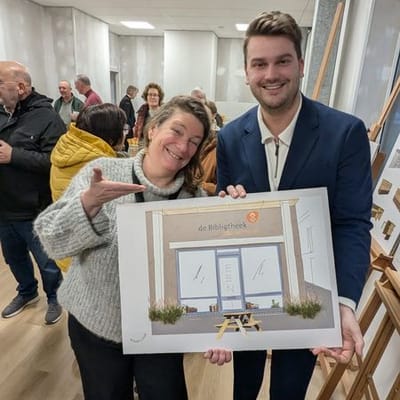 Een groot aantal geïnteresseerde Woubruggenaren was aanwezig om onder het genot van een hapje/drankje de plannen te bekijken, zowel vrijwilligers die binnenkort gaan helpen bij het bemensen van de nieuwe locatie als lezers die de oude bibliotheek nog dagelijks missen en niet kunnen wachten om weer door de boekenkasten te struinen.