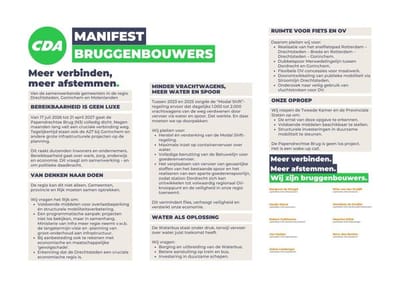 De negen CDA-lijsttrekkers uit de regio Drechtsteden, Gorinchem en Molenlanden ondertekenden Op woensdag 4 maart gezamenlijk het manifest “Bruggenbouwers – Meer verbinden. Meer afstemmen.” bij de Papendrechtse Brug (N3). Aansluitend werd het manifest officieel overhandigd aan CDA-Tweede Kamerlid Luciënne Boelsma, waarna een ronde tafel gesprek plaatsvond over de bereikbaarheid van de regio.