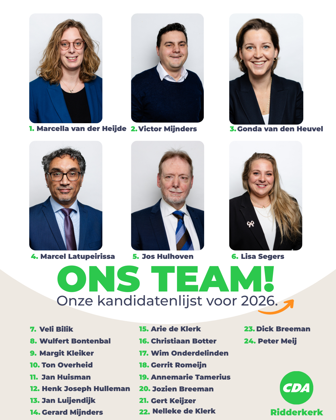 Het CDA staat voor een fatsoenlijk Ridderkerk. Een dorp waar je prettig kunt wonen, je veilig voelt en waar we omzien naar elkaar. Goed bestuur begint niet in het gemeentehuis, maar op straat – bij onze Ridderkerkse gezinnen, jongeren, ouderen, ondernemers en verenigingen.Wij blijven inzetten op wonen: betaalbaar voor starters, passend voor gezinnen en zorgzaam voor senioren. Veiligheid is geen luxe, maar een basisrecht. Iedereen moet zich thuis, online en op straat veilig voelen. En blijven wij pal staan voor onze sport- en muziek verenigingen. Zij zijn het kloppend hart onze Ridderkerkse gemeenschap. Zo bouwen wij aan een Ridderkerk waar vertrouwen en verbinding centraal staan. Voor een fatsoenlijk Ridderkerk nù en in de toekomst!